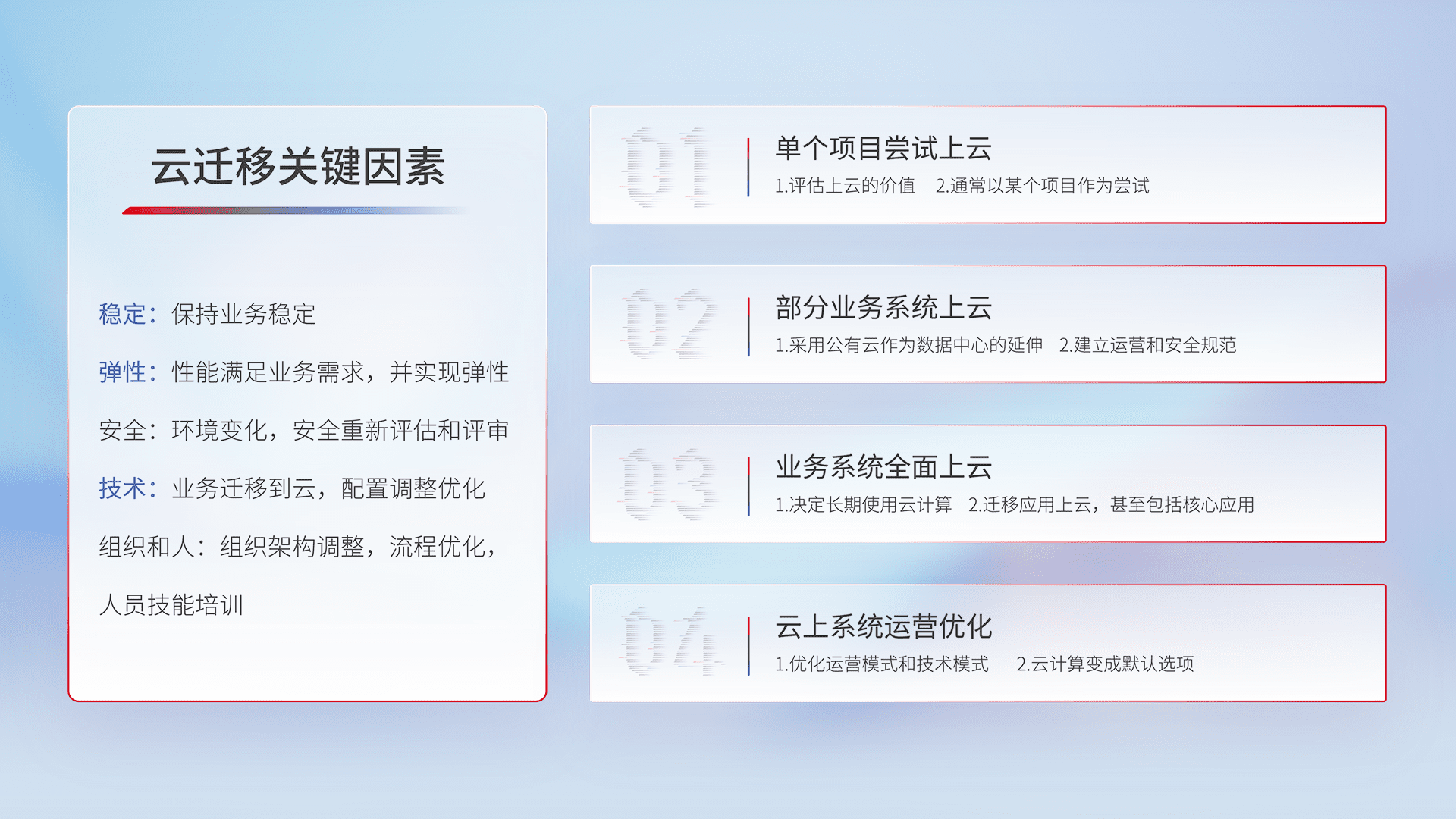 结合实际业务,,从规划设计、、云平台选型、、、、云原生改造、、、数据迁移、、、集成交付,,迁移全过程为客户识别最佳上云路径,,做好风险识别管理,,,,设计网络架构、、、、身份权限、、、、安全审计合规、、操作审计、、、日志审计、、监控告警策略、、、多站点容灾设计等,,,对云上基础设施进行整体规划,,,,提升IT治理水平,,,以满足弹性、、、高可用、、、高性能的需求。。。
