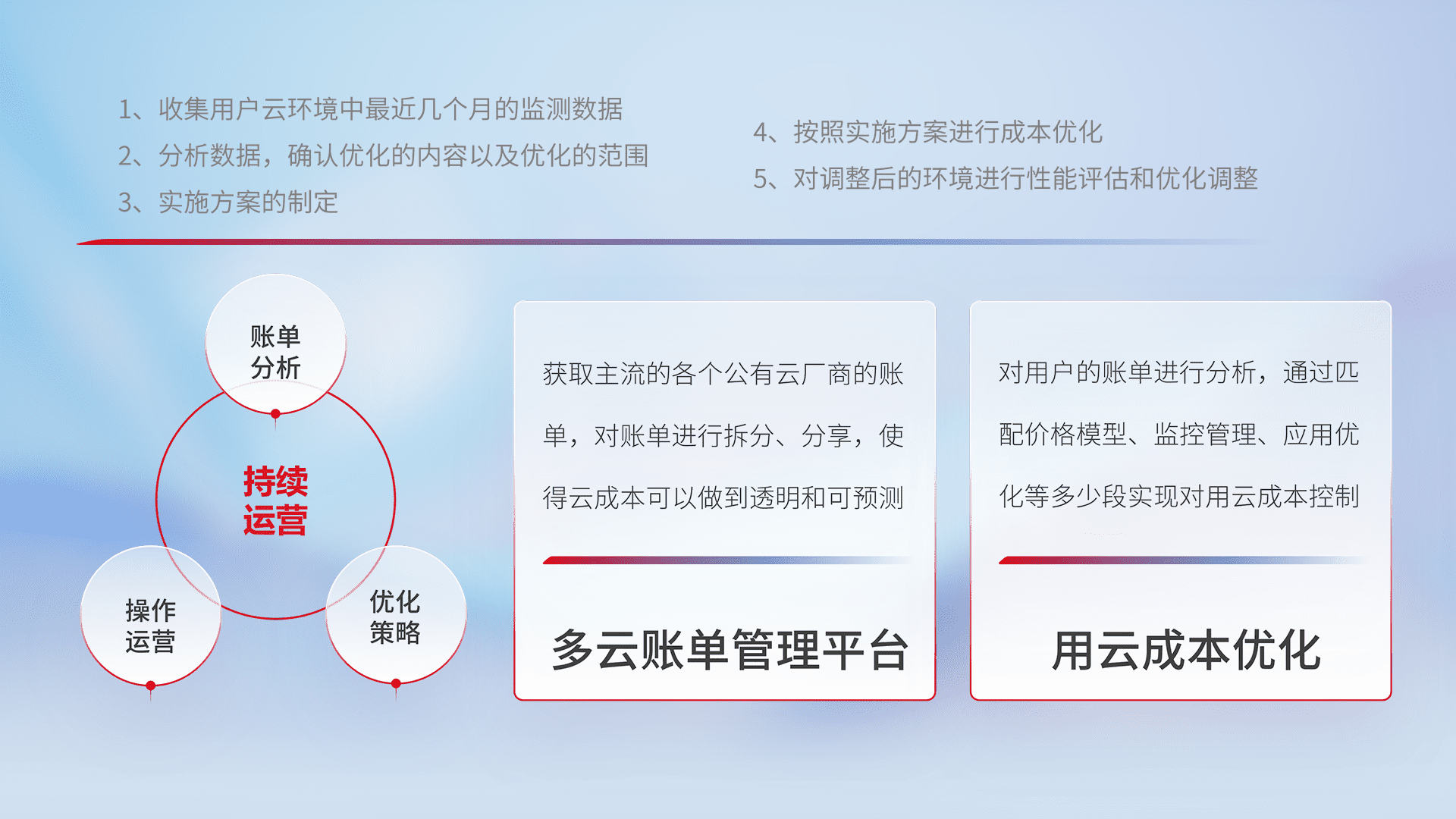 通过多云纳管,,以统一的资源数据模型把客户的云资源进行抽象和封装,,,进而实现对多云资源的统一操作,,,保障云资源管理的可靠性、、、稳定性与可用性。。。。量身定制化运维内容,,配置、、开发运维、、、、补丁管理、、、备份、、监控、、、、认证和访问管理、、审计和日常巡检等,,,,保障在用云过程中的可靠度,,,,稳定度以及高可用率。。